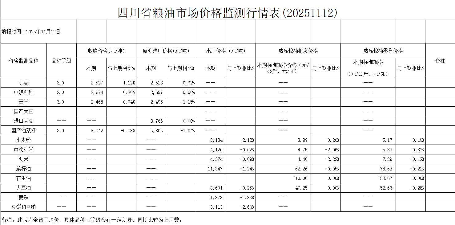 四川省粮油市场价格监测行情表(2025年11月)