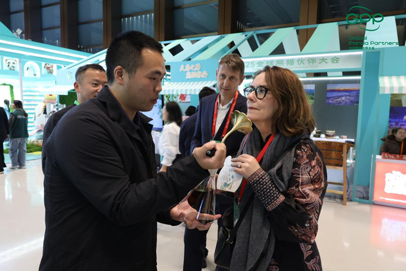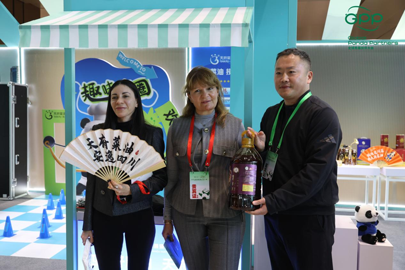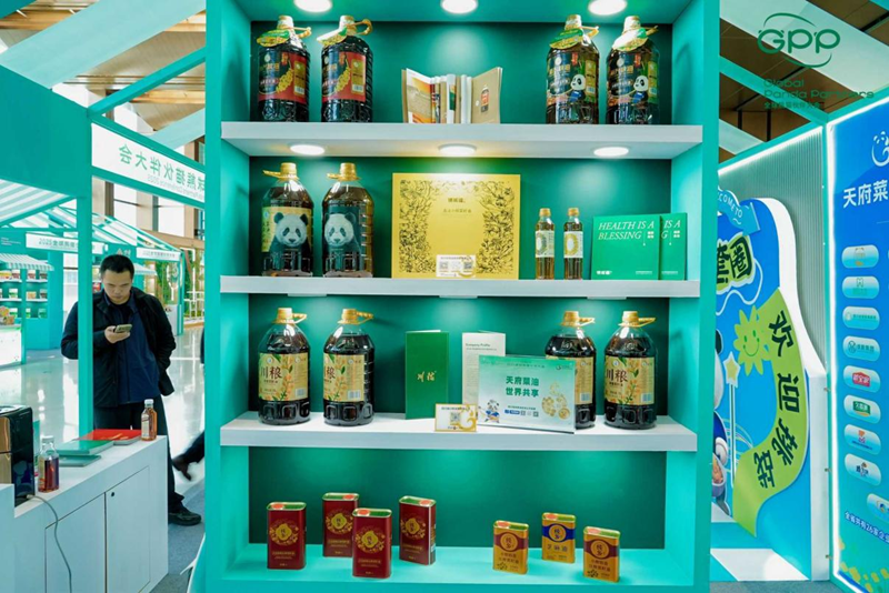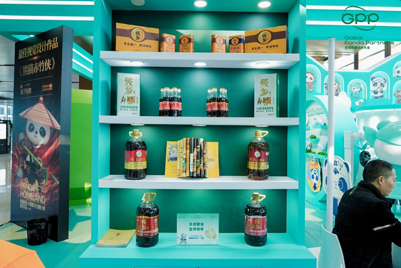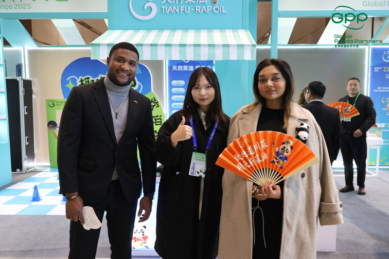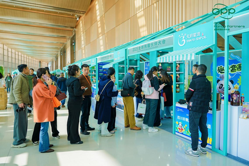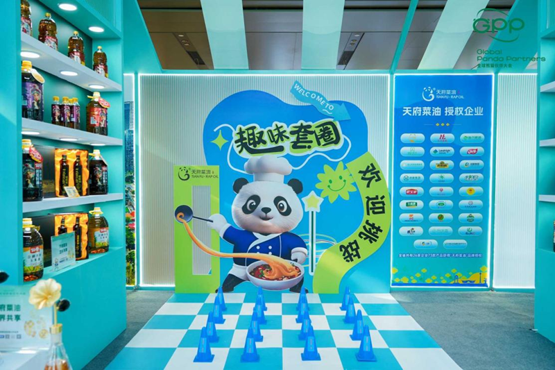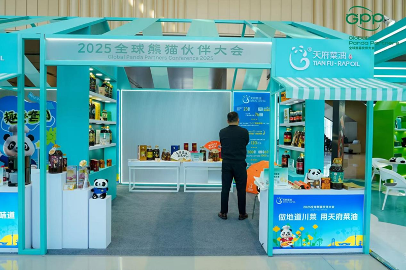 11月20日至22日,2025全球熊猫伙伴大会配套活动熊猫文创集市在成都空港国际会议中心亮相,“天府菜油”展位吸引众多观众参观打卡。