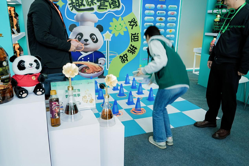观众在“天府菜油”展位参与互动游戏。曹鹏 摄